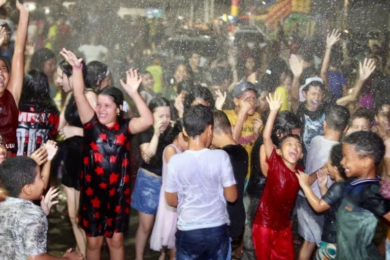 Um dos momentos mais marcantes do dia foi o tradicional “banho de neblina”, promovido pelo Corpo de Bombeiros, que encantou o público. A atividade consiste em lançar jatos de água em pequenas gotículas sobre as crianças, criando um clima refrescante e de pura diversão, encerrando o dia com muitas risadas, música e sorrisos.