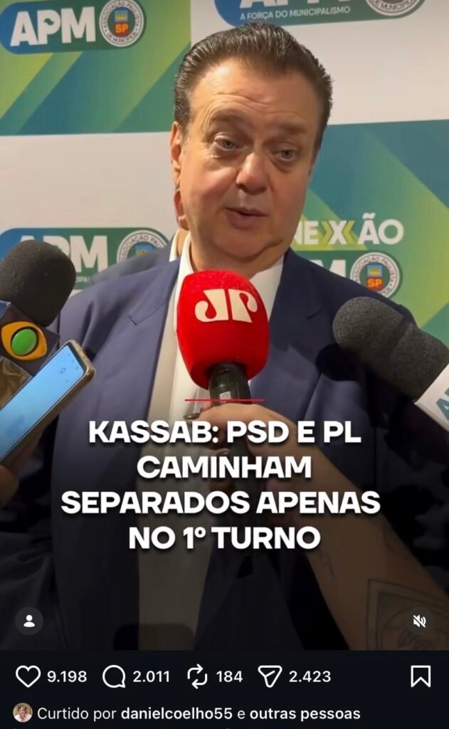 A manifestação ocorreu após Kassab afirmar, em entrevista à Jovem Pan de Marília, que o PSD caminhará separado do PL no primeiro turno, mas estará junto no segundo. “Tenho conversado com Flávio Bolsonaro. Temos uma relação clara, entendimento claro de que vamos caminhar no primeiro turno separados, mas seguiremos juntos no segundo turno”, declarou o dirigente partidário.