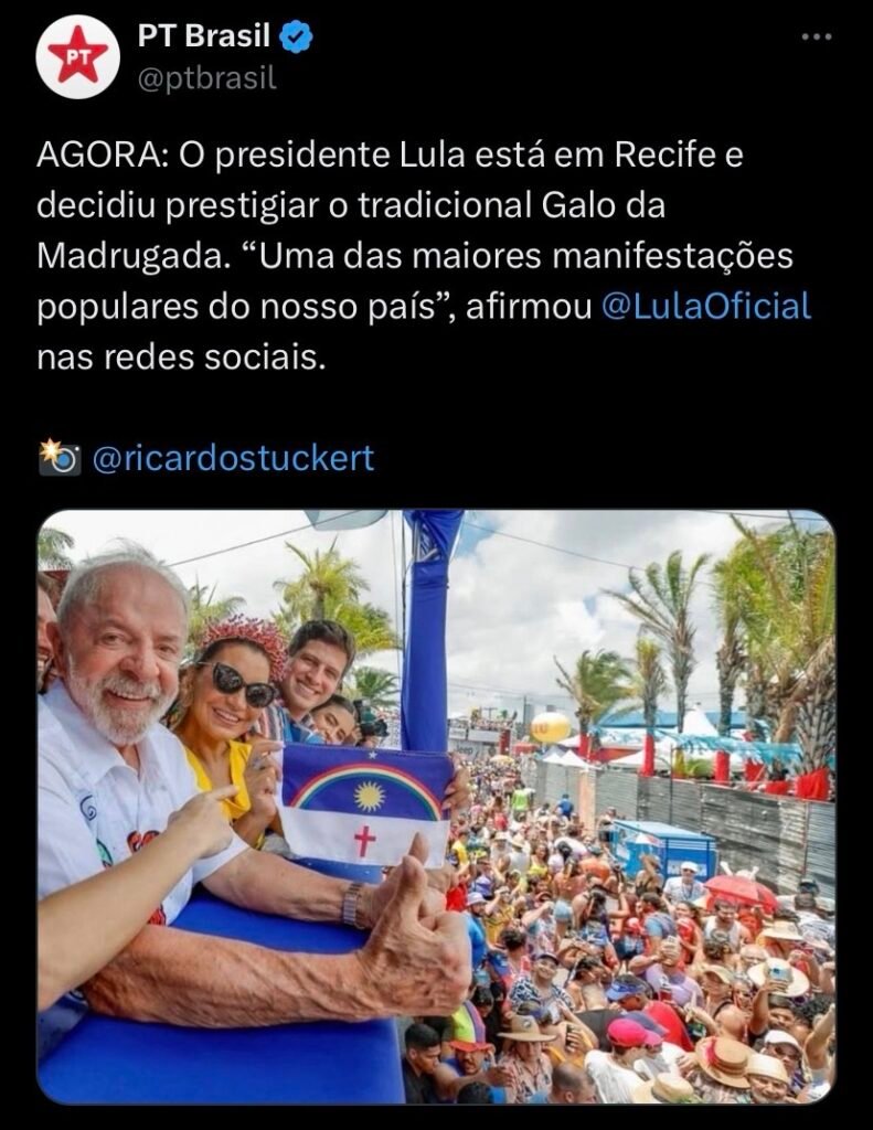 Uma publicação do PT nas redes sociais sobre a participação do presidente Lula (PT) no maior bloco do mundo, o Galo da Madrugada, neste sábado (14), está dando o que falar.